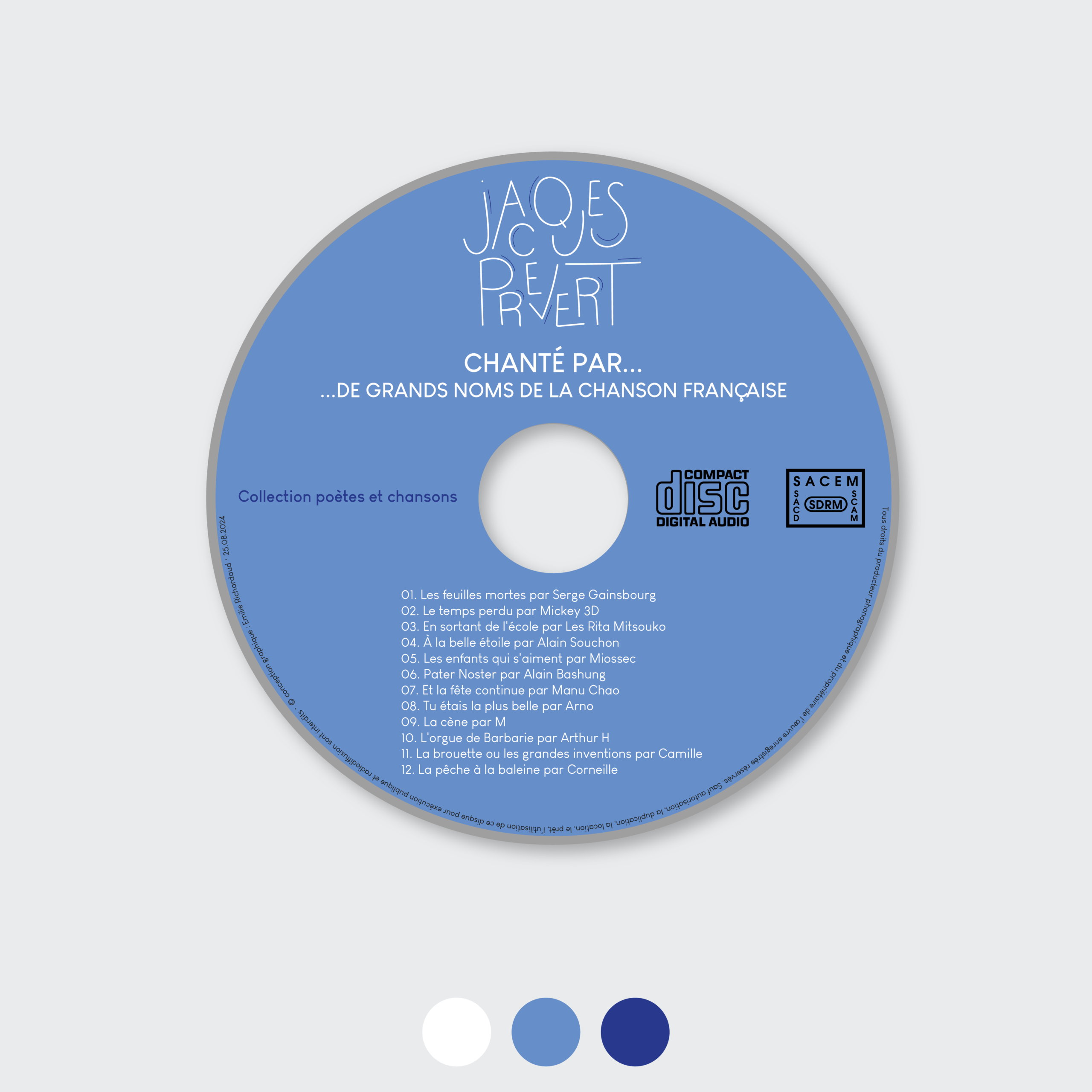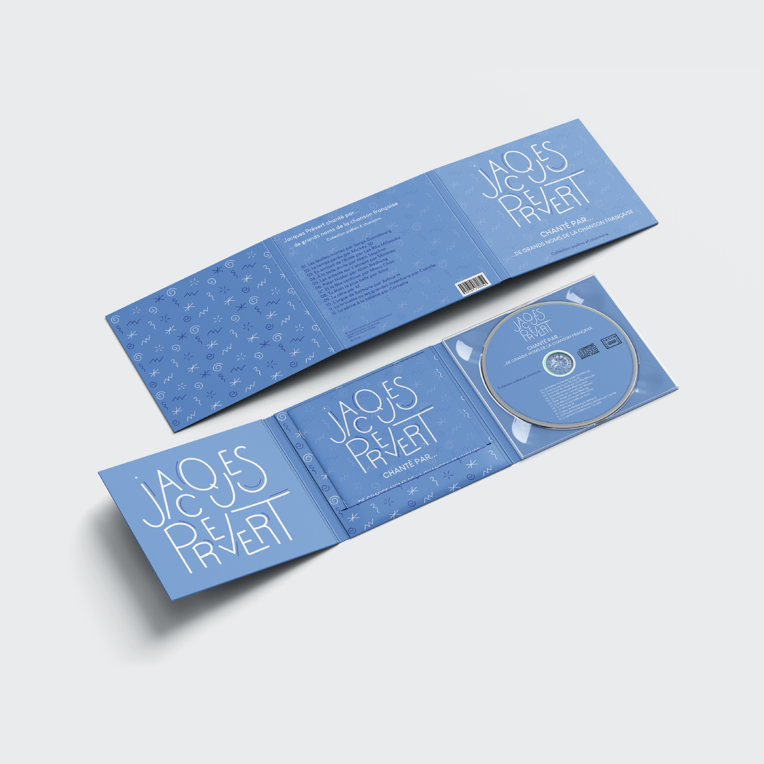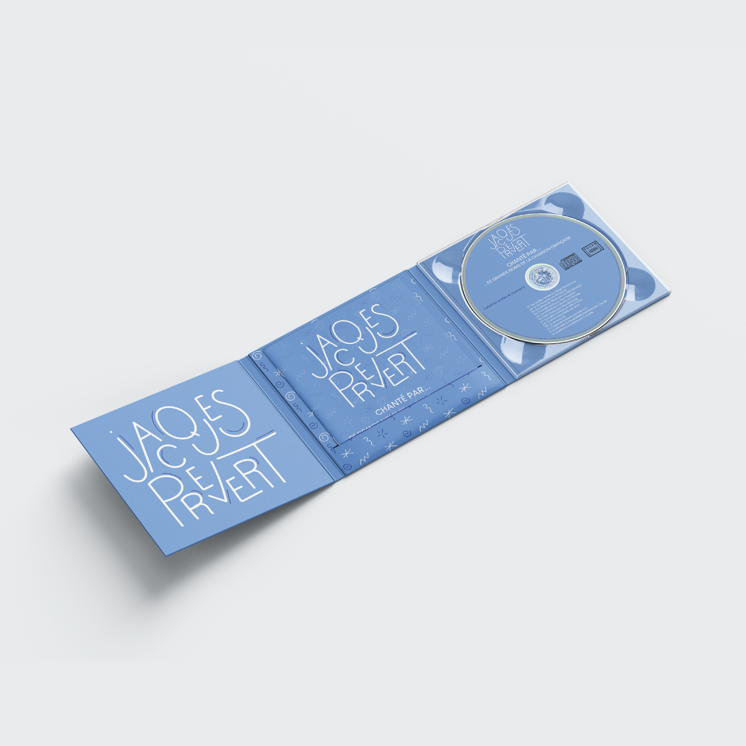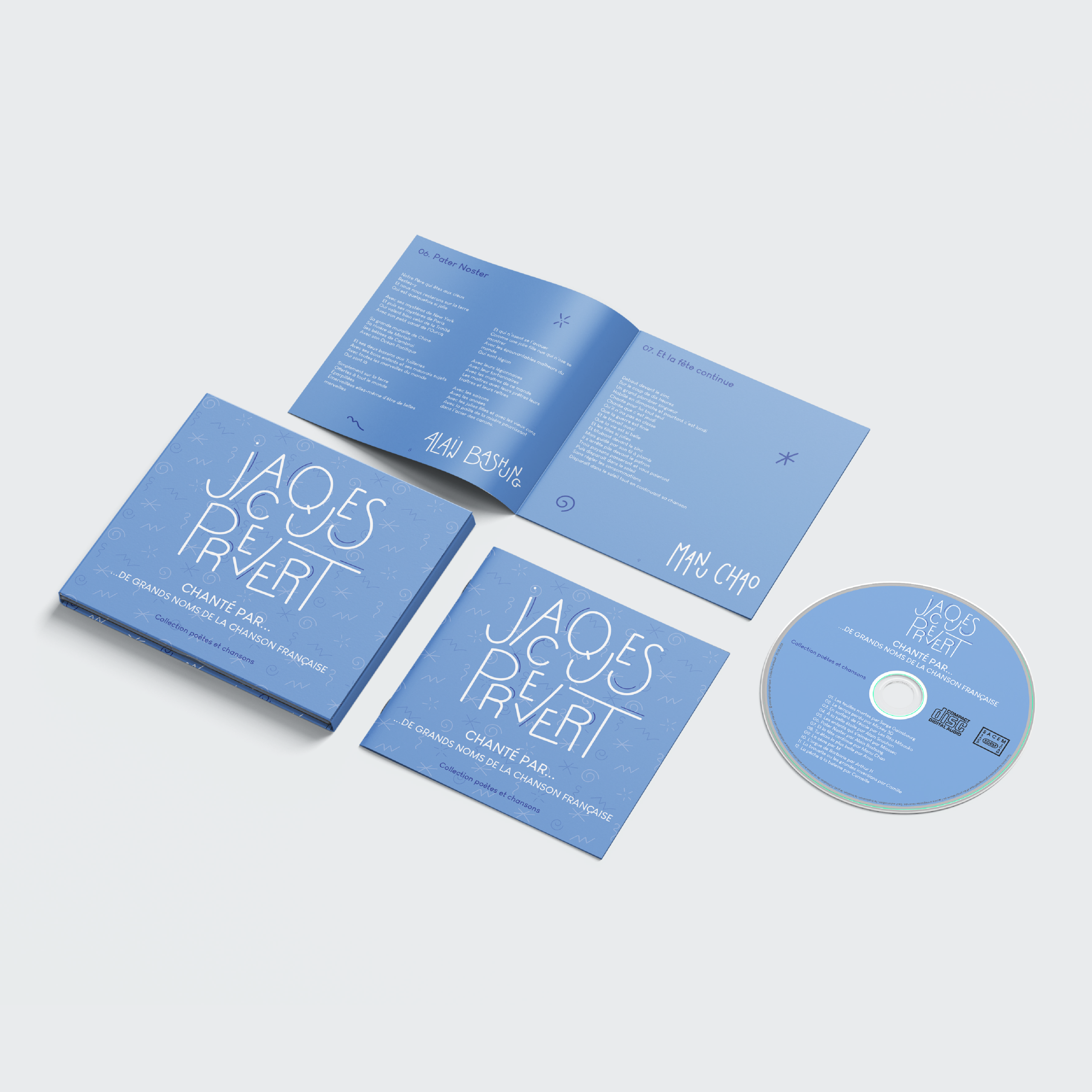 La demande : Pour une maison d’édition musicale qui lance une nouvelle collection de disques sur le marché autour des poètes du XXe siècle, j’ai créé une maquette de digipack d’un album ainsi que le livret intérieur et la rondelle du CD.