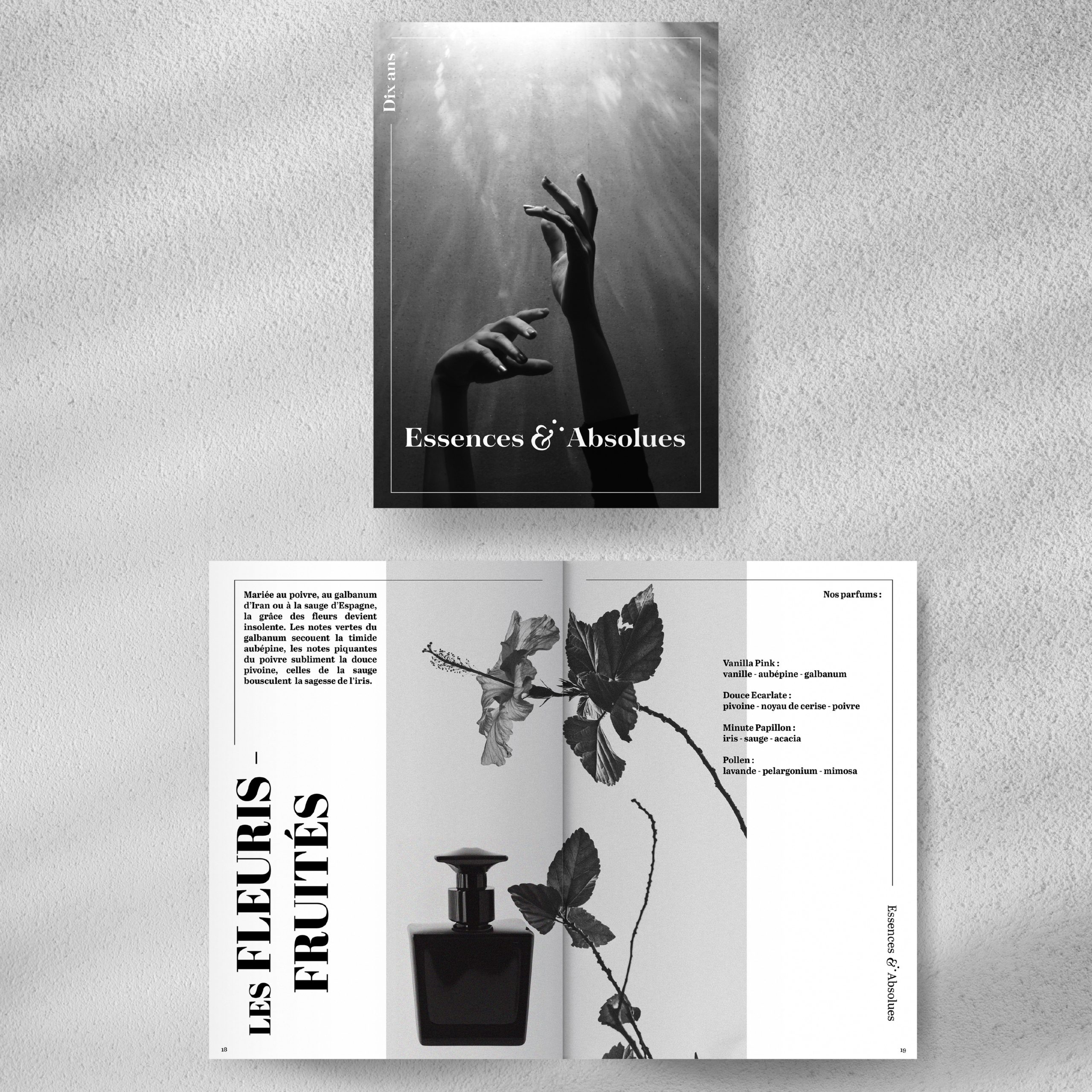 La demande : Pour son dixième anniversaire, le parfumeur « Essences & Absolues » souhaite distribuer une brochure promotionnelle à ses clients mettant en avant seize fragrances réparties en quatre familles.
