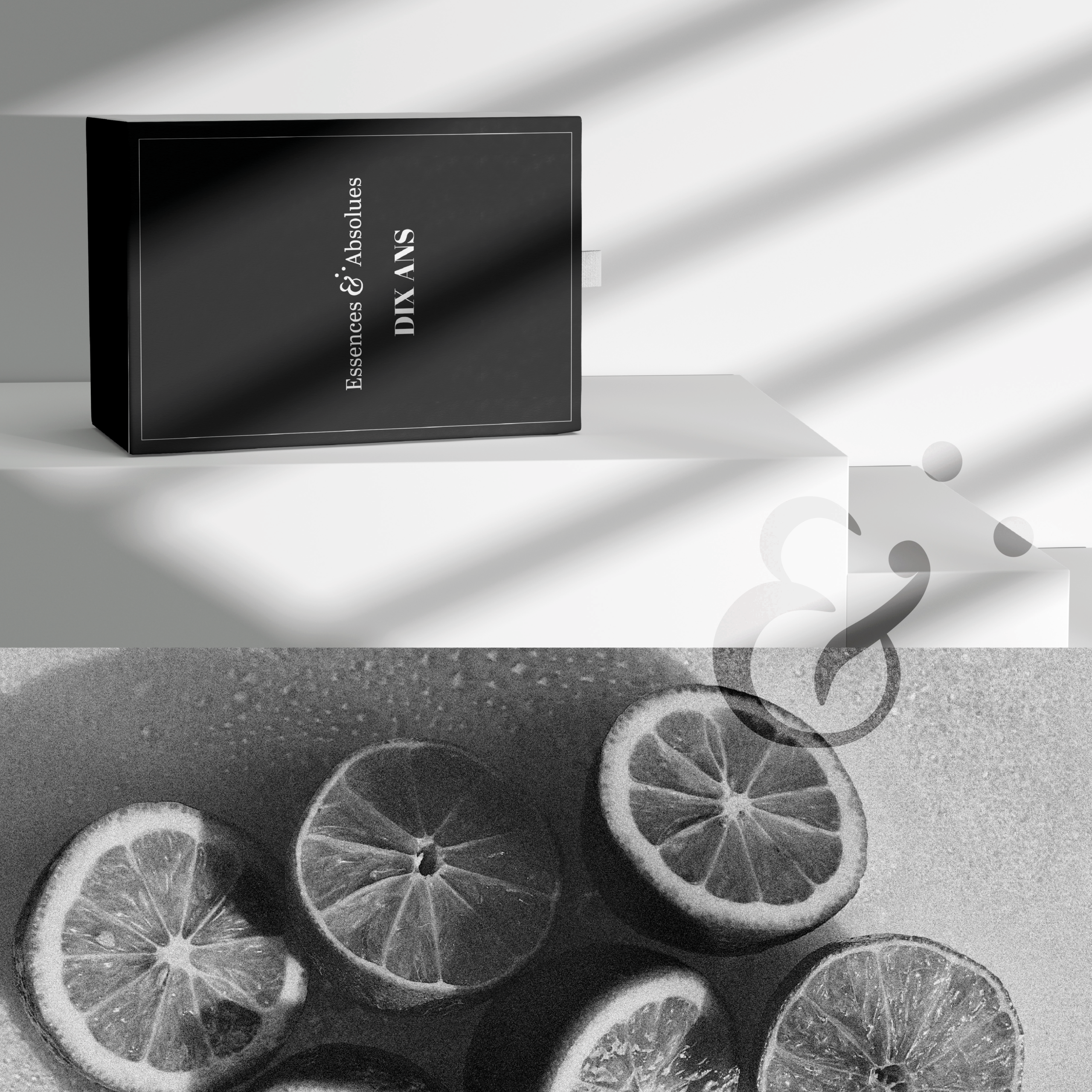 Pour ce projet, j’ai fait le choix de travailler en noir et blanc, synonyme de qualité et de prestige. En me penchant sur des grandes maisons de parfumerie et de couture, nombreuses sont celles qui arborent un logo en noir et blanc. L’audace ici c’est de créer une brochure et un coffret entièrement en noir et blanc, laissant toute la place aux échantillons de parfums qui y seront intégrés pour révéler leurs fragrances.