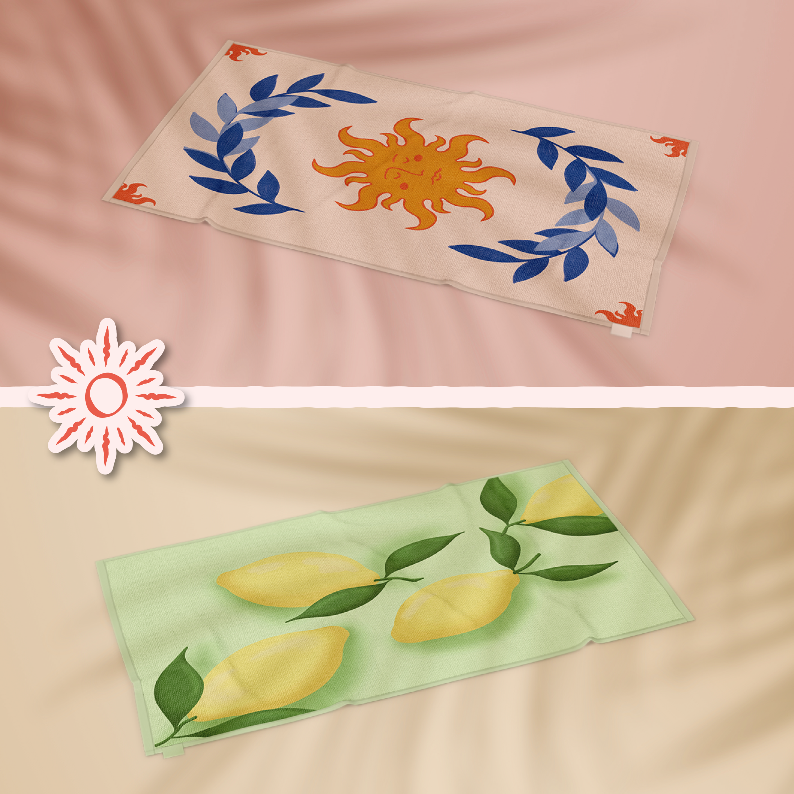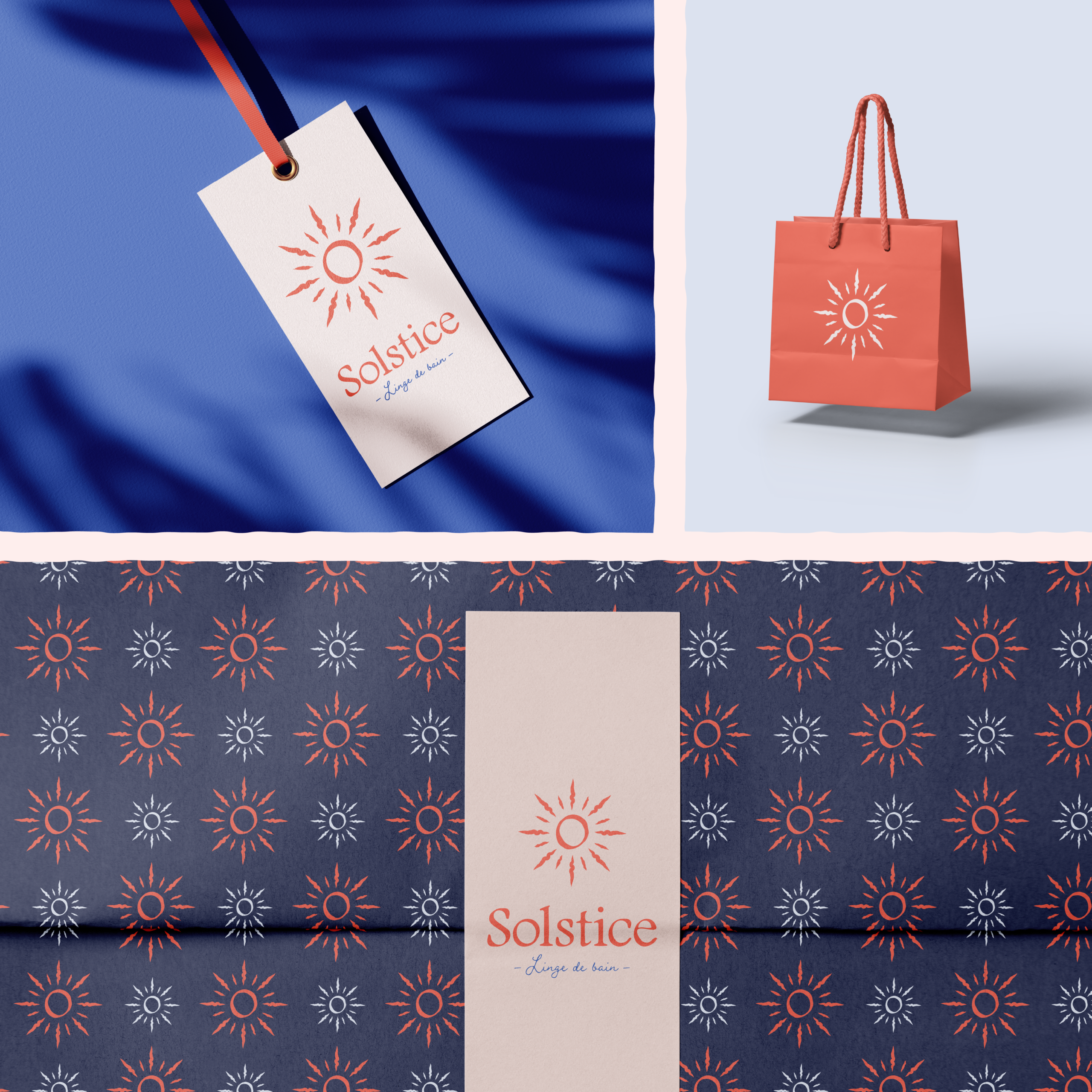 Pour ce projet j’ai travaillé autour du soleil évoqué notamment par le nom de la marque. Les différentes recherches autour des inspirations italiennes, de la Dolce Vita m’ont amenée à conserver cette idée de soleil comme élément du logo principal. J’ai créé une identité visuelle à la fois douce et colorée pour allier l’élégance et la chaleur italienne. Les draps de bain ont été imaginé dans des coloris assez différents pour proposer de la diversité. L’un conserve les couleurs de l’identité visuelle de la marque, l’autre, dans une toute autre palette de couleurs, propose un motif frais et solaire.